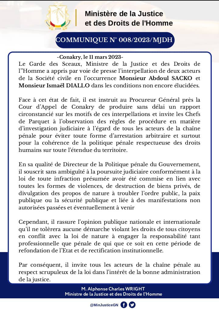 Dans un communiqué, le ministre de la justice et des droits de l’Homme, Alphonse Charles Wright, a demandé des explications au procureur général près la cour d’appel de Conakry, pour l’arrestation d’Abdoul SACKO et Ismaël DIALLO, tous deux, acteurs de la société civile.
