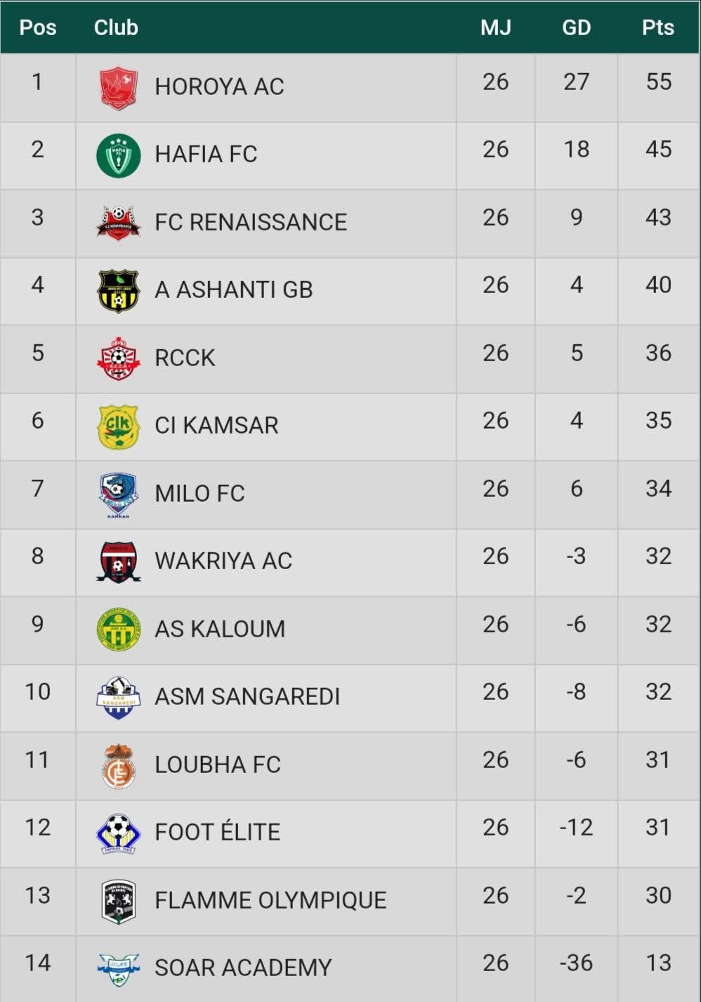 Aussi, le maintien se jouait au bas du tableau. Et finalement, c’est le Hafia FC qui termine à la seconde place et qui se qualifie en campagne africaine. Pour ce qui est de la relégation, c’est la Flamme Olympique qui accompagnera l’académie SOAR en Ligue 2.
